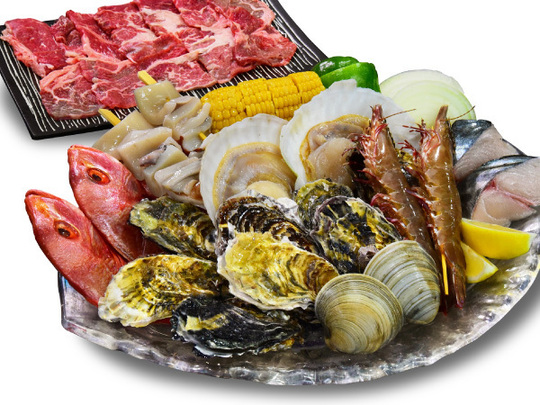 ・岩牡蠣 または 真牡蠣 ・イカ串 ・レンコ鯛干物 ・魚の切り身 ・海老 ・ホタテ貝 ・ホンビノス貝 ・野菜 ・くら下ロース肉120g