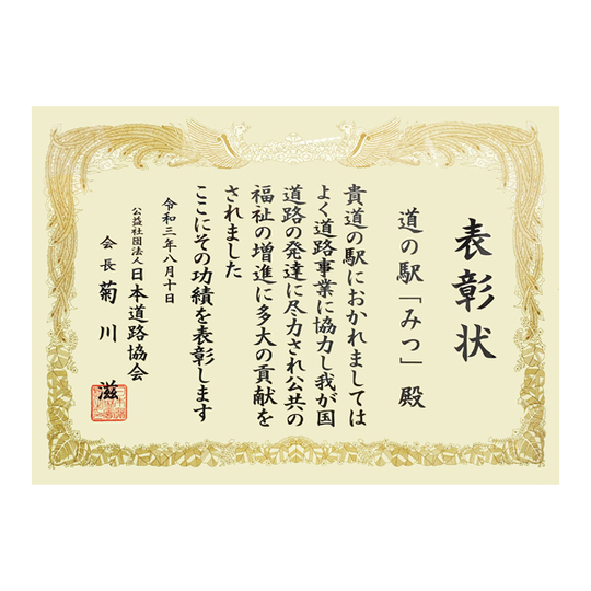 令和3年8月30日 西播磨総合庁舎にて、日本道路協会道路功労者表彰をいただきました。道の駅みつでは年間を通し自然のロケーションを活かした休憩スペースや地域の観光情報の発信などサービスの提供を行い、また地元の新鮮な魚介や野菜の販売、地元の食材を使ったお料理の提供など地域の生産者とお客様との交流の場として気軽にご利用いただける道の駅を目指してきました。その功績が認められ、このような賞をいただけることは本当に光栄です。今後も充実したサービスの提供を目指し発展していきたいと思います。これからも、道の駅みつをよろしくお願いします。